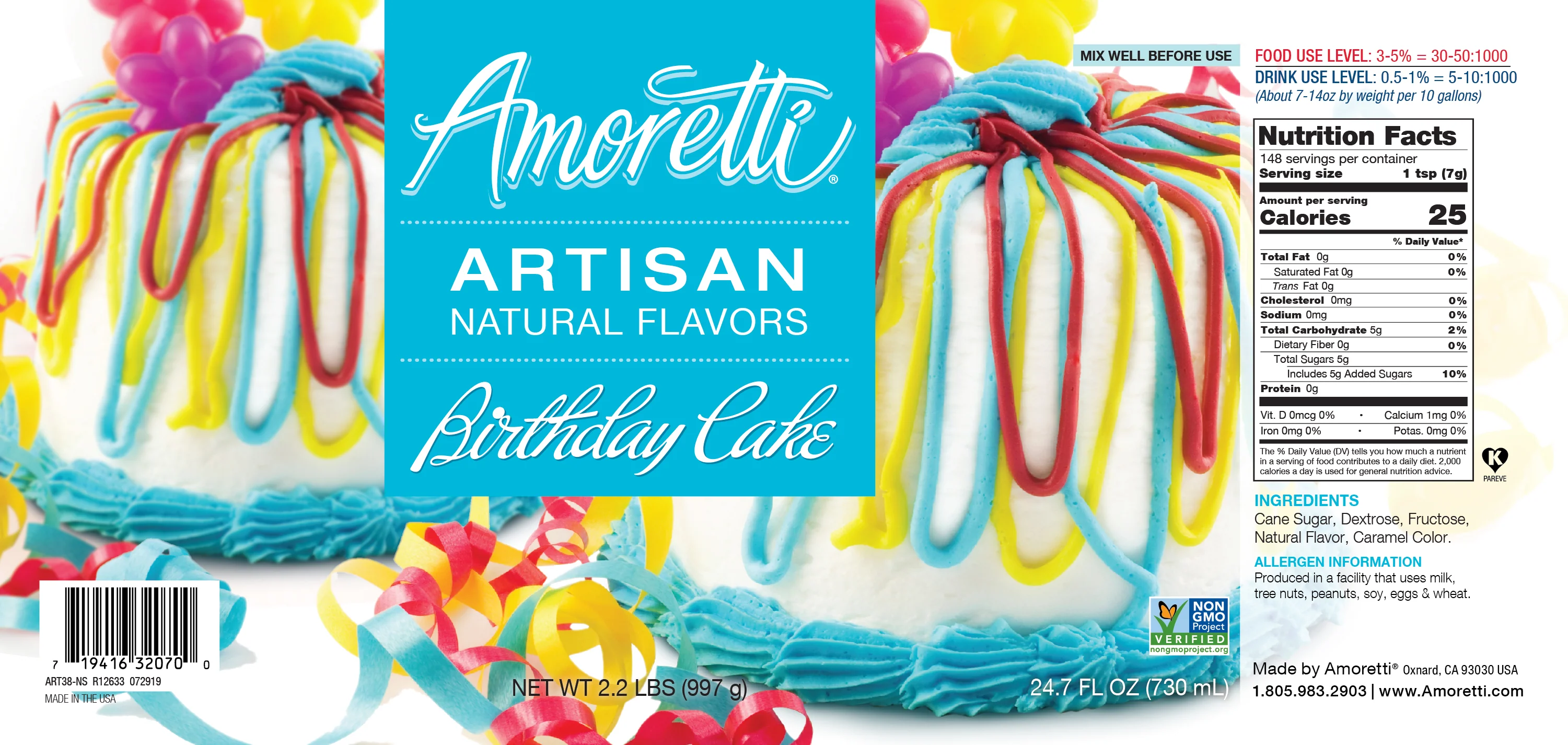 Amoretti’s Natural Birthday Cake Artisan Natural Flavor Paste captures the flavor of festive vanilla birthday cake year-round. Showcasing beautiful color and irresistible sweetness – add the comforting taste reminiscent of childhood in all your gourmet creations. Experience our perfect craftsmanship in every step from refined flavor, elegant aroma, and smooth texture. Make everyday a celebration – with Amoretti!
